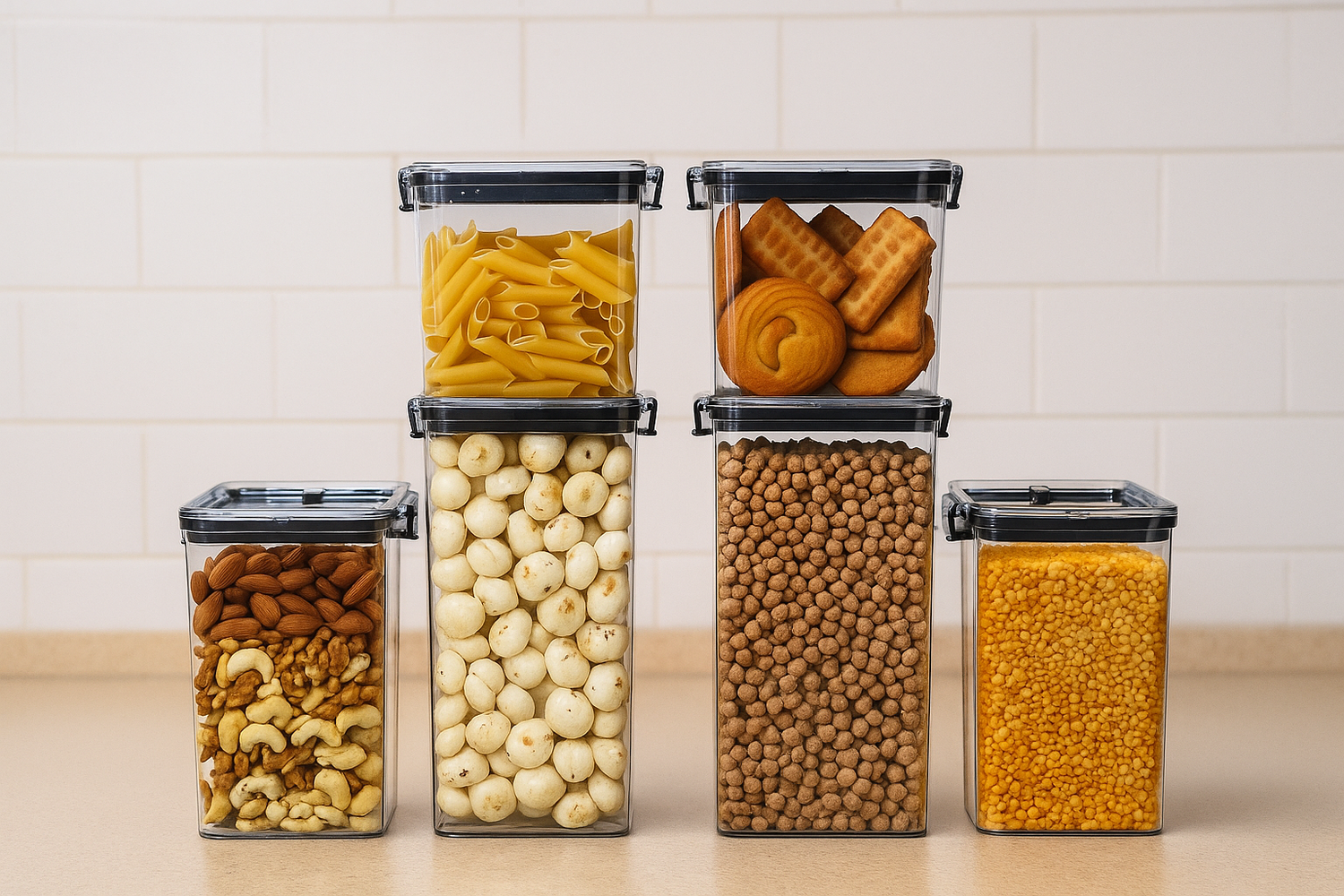 You can store rice, pulses, cereals, flour, snacks, cookies, spices, pasta, sugar, dry fruits, coffee, and even liquids like sauces or soups (if specified leak-proof).